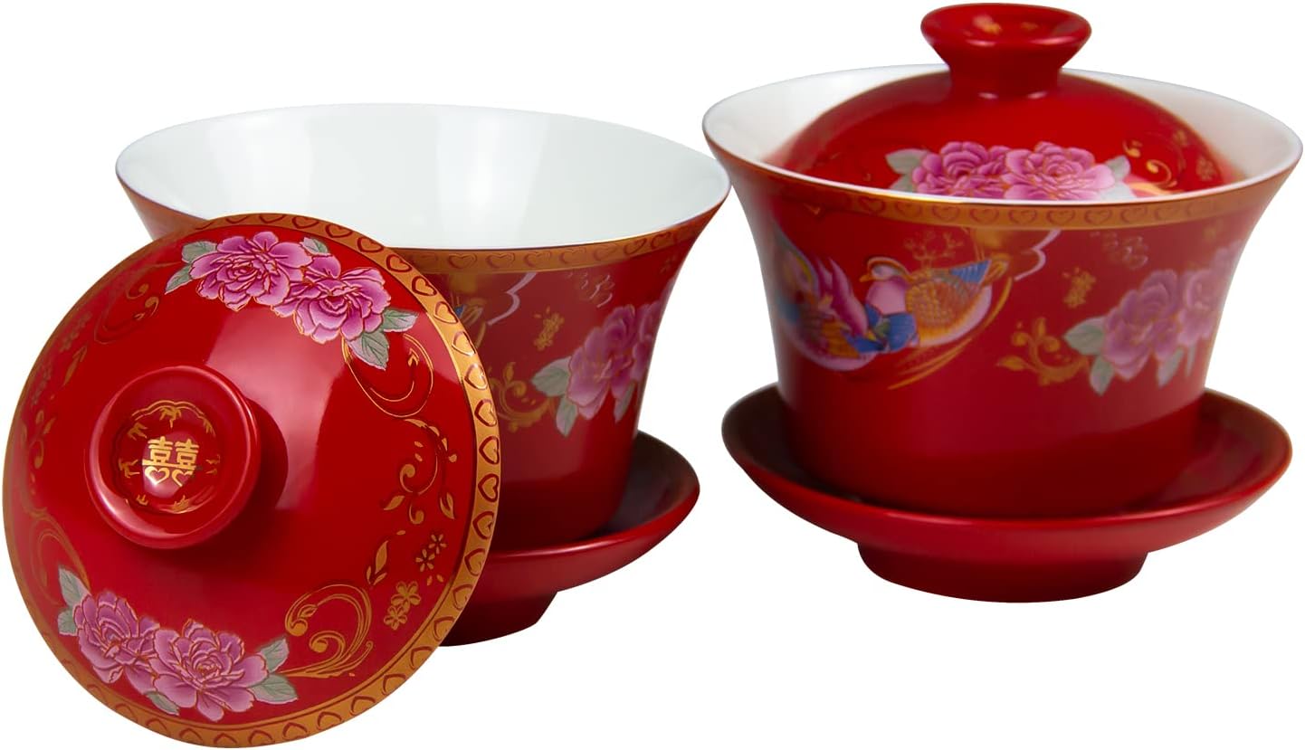 Amazon Com Kcgani 1 Couple Red Wedding Porcelain Tea Set Chinese Traditional Cover Bowl Saucer Decoration Ceramic Tea Pot Cup Tureen For Ceremony Wedding Birthday Party Decor Gift 3 7 Mandarin Duck Tea
